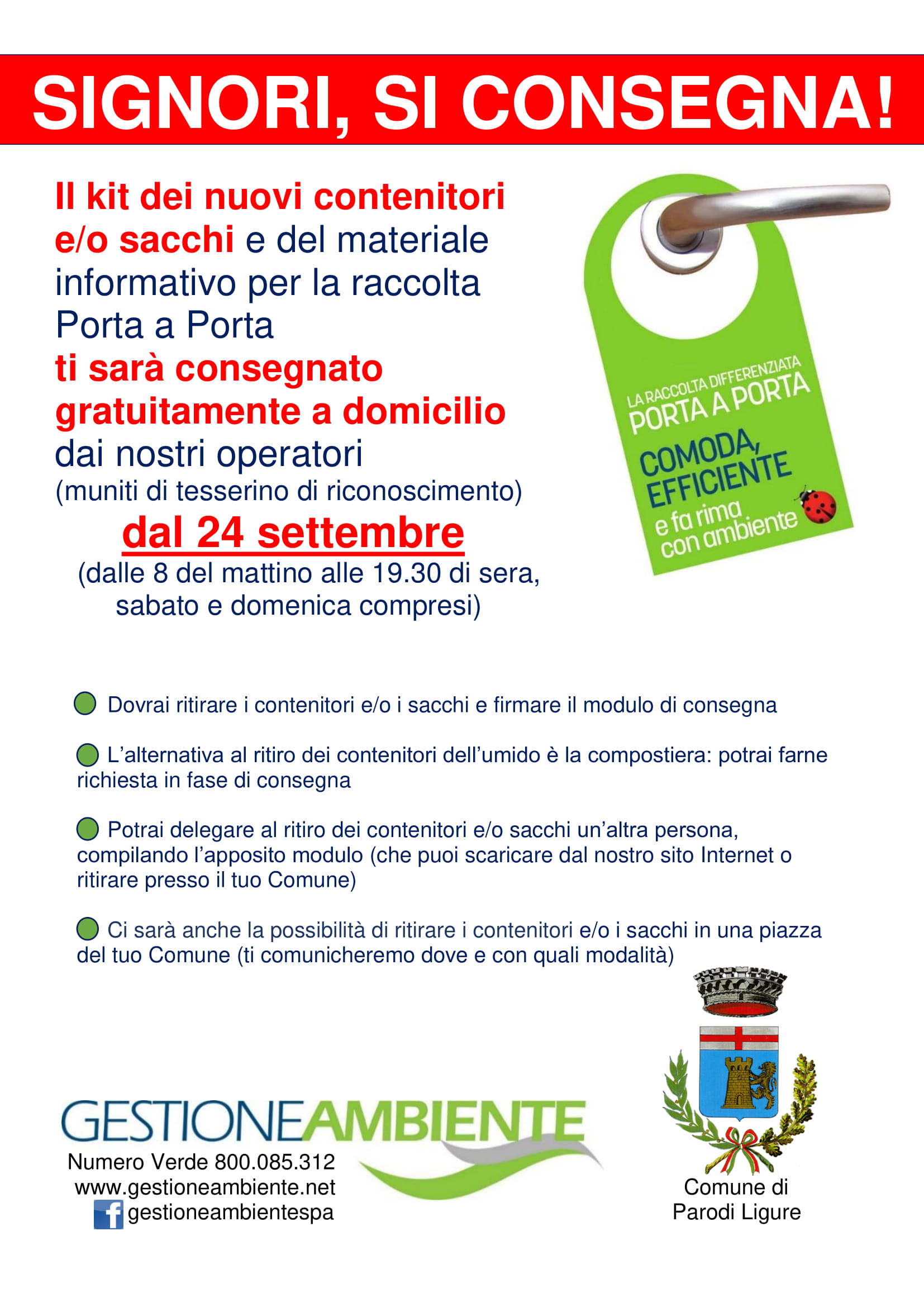 Il kit dei nuovi contenitori e/o sacchi e del materiale informativo per la raccolta Porta a Porta sarà consegnato a domicilio dagli operatori di Gestione Ambiente (muniti di tesserino di riconoscimento) dal 24 settembre dalle 8 alle 19,30, sabato e domenica compresi.