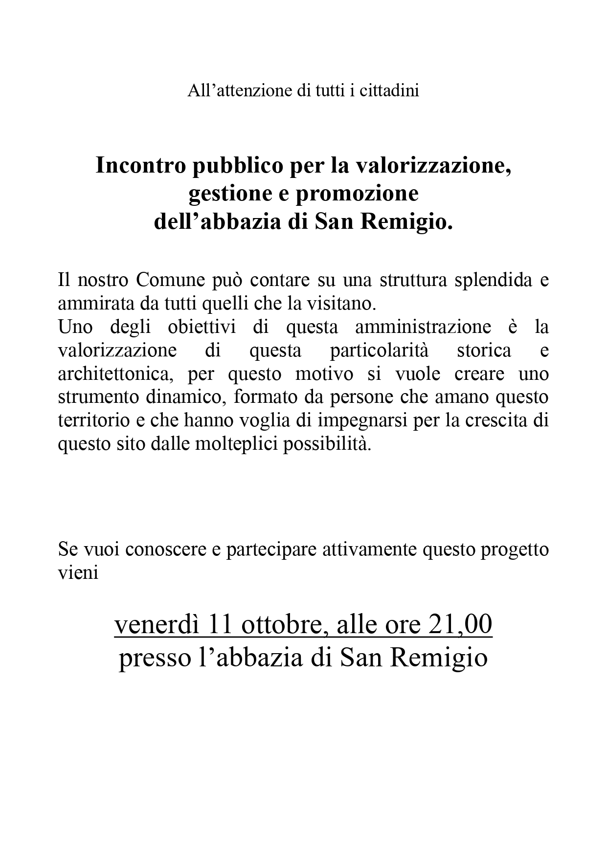 Incontro pubblico per la valorizzazione, gestione e promozione dell’abbazia di San Remigio.
