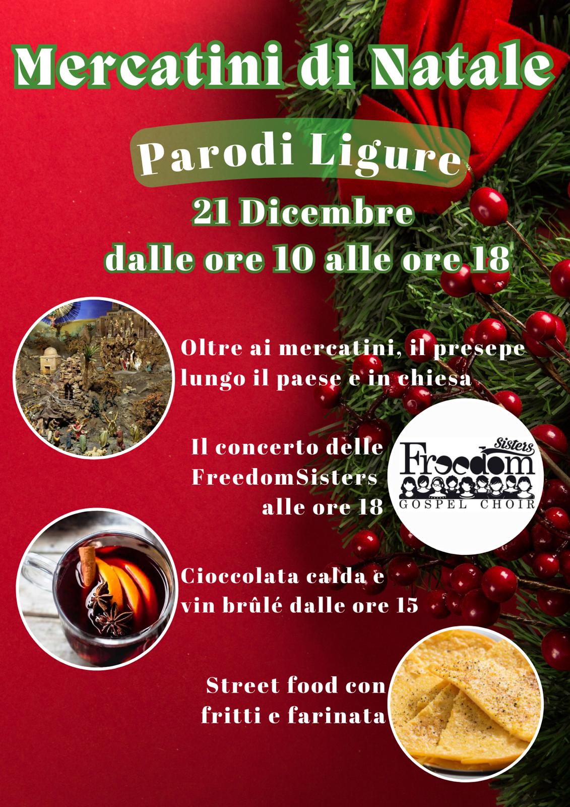Street food con fritti e farinata. dalle ore 15,00 cioccolata calda e vin brulè, presepe lungo le il Paese e in Chiesa, alle ore 18,00 concerto del coro gospel Freedom Sister.