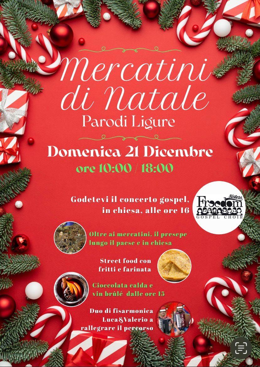 Domenica 21 dicembre. Street food con fritti e farinata. dalle ore 15,00 cioccolata calda e vin brulè, presepe lungo il Paese e in Chiesa, alle ore 16,00 concerto del coro gospel Freedom Sister.