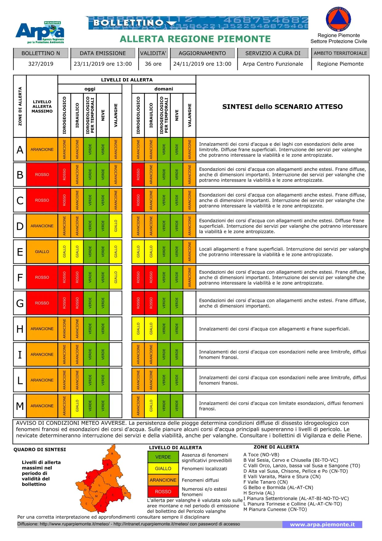 Servizio Protezione Civile. Aggravamento dell'allerta meteo da arancione a ROSSA - MASSIMA CRITICITA' (esondazioni dei corsi d'acqua con allagamenti anche estesi, frane diffuse, anche di dimensioni importanti in zona di allerta G) dal pomeriggio di sabato 23 novembre.