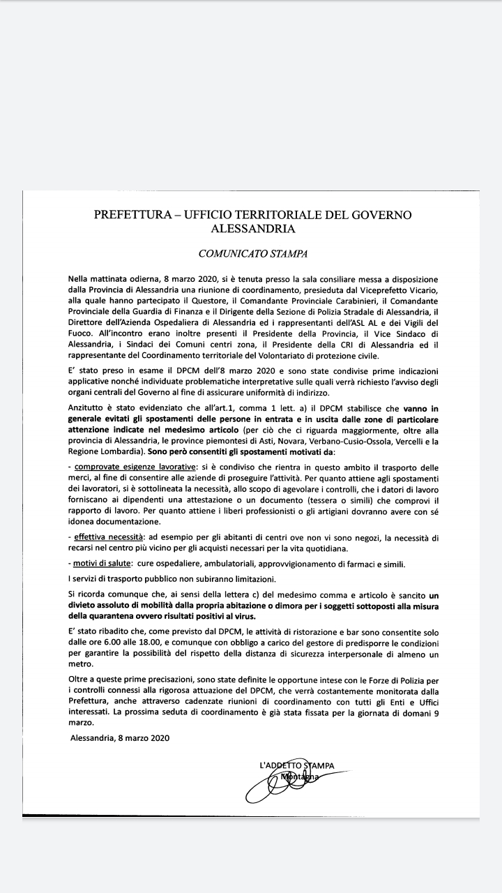 In allegato il testo del comunicato stampa emesso dalla Prefettura di Alessandria contenente le prime indicazioni applicative del DPCM dell'8 marzo 2020