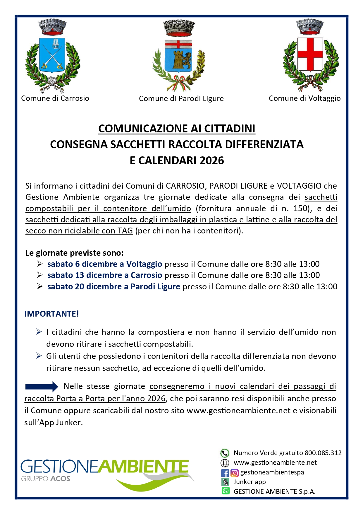 Si avvisa inoltre che sabato 20 dicembre 2025, dalle ore 8.30 alle ore 13.00, al piano terra del Palazzo Municipale, un incaricato di Gestione Ambiente Spa consegnerà i sacchetti compostabili per il contenitore dell'umido (fornitura annuale di n. 150) e i sacchetti dedicati alla raccolta degli imballaggi in plastica e lattine e alla raccolta del secco non riciclabile con TAG (per chi non conferisce con i contenitori).